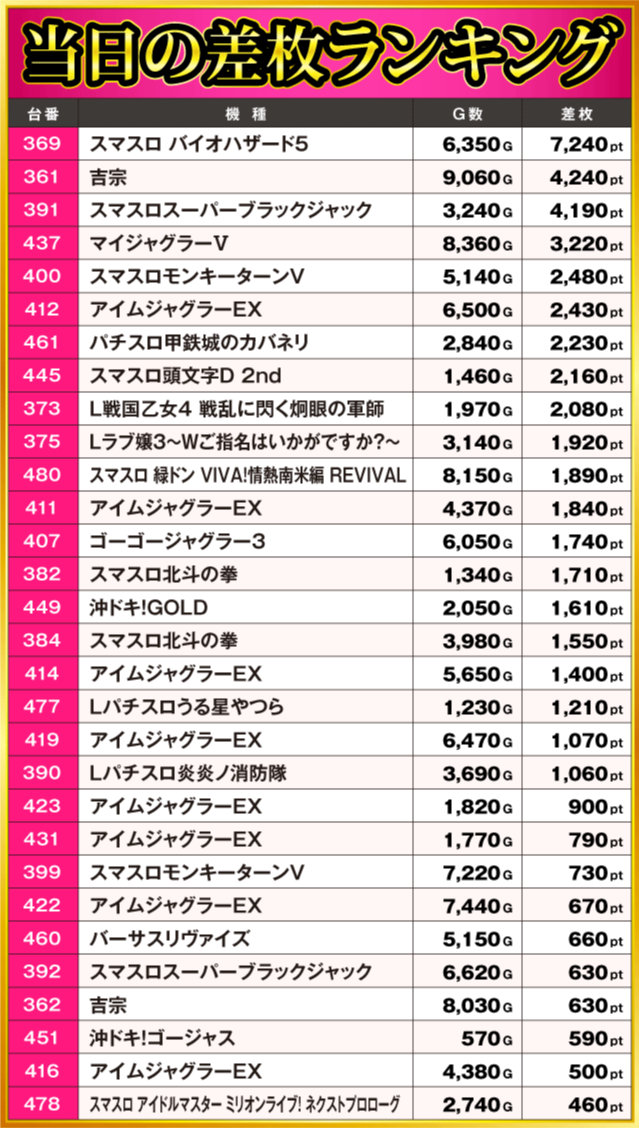 この日、最もプレイヤーの注目を集めたのが『スマスロ バイオハザード5』で、369番台が+7,240ptを叩き出しランキングトップに。また、ジャグラーシリーズも奮闘しており『マイジャグラーⅤ』や『アイムジャグラーEX』、『ゴーゴージャグラー3』など、差枚TOP30に10台がランクインする盛況ぶりを見せていた。
