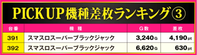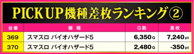 次にPICK UP機種の状況を見ていこう。ランキングを制した『スマスロ バイオハザード5』以外にも複数の好調台を確認。『吉宗』と『スマスロスーパーブラックジャック』から+4,000pt超が発生している上に、3機種トータルの全6台中5台がプラス差枚で終了する見事な結果を残している。