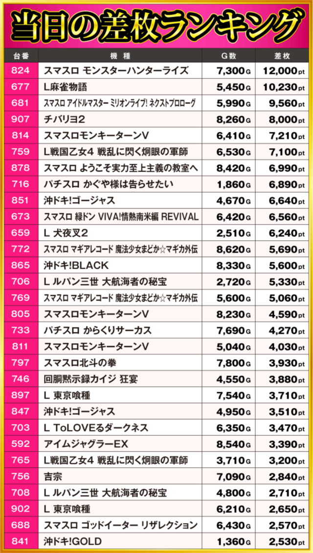 当日の差枚ランキング