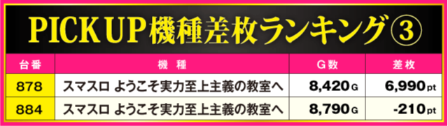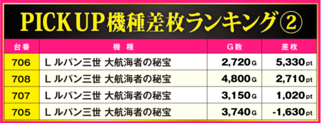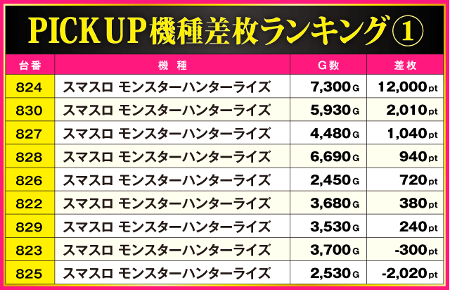 次にPICK UP機種をチェックしていこう。『Lルパン三世 大航海者の秘宝』からは+5,330pt、『スマスロ ようこそ実力至上主義の教室へ』からは+6,990ptを確認。また、ランキングを制した『スマスロ モンスターハンターライズ』は全9台中7台がプラス差枚という見事な結果を残している。