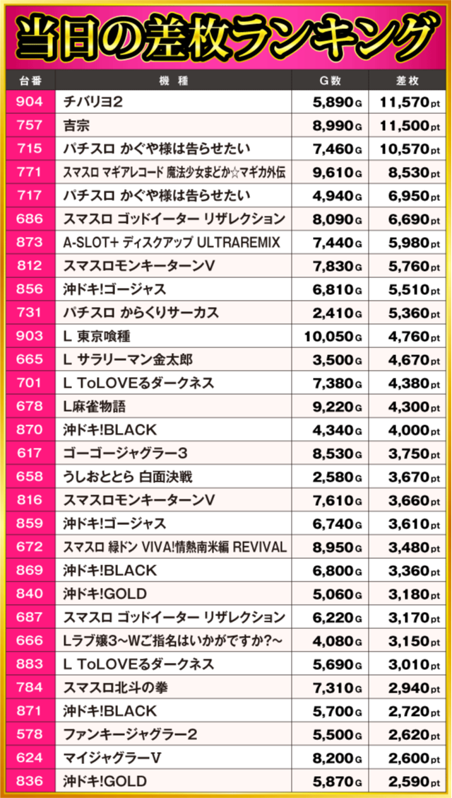 早速、店内状況をチェックすると『チバリヨ2』が+11,570ptを叩き出しランキングトップに。さらに、『吉宗』が+11,500pt、『パチスロ かぐや様は告らせたい』が+10,570ptと、ランキングベスト3が全て万枚超を達成する実にハイレベルな結果を残している。