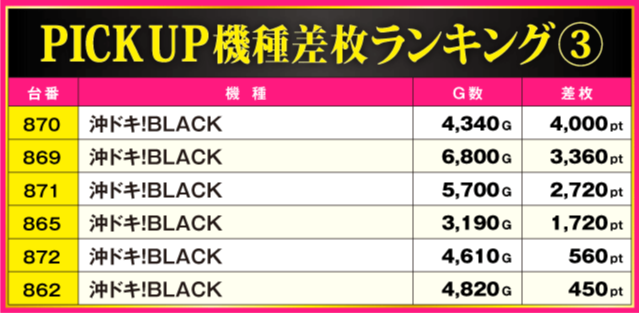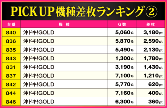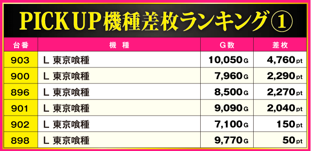 次にPICK UP機種をチェックしていこう。『L 東京喰種』は、903番台の+4,760ptを筆頭に+2,000pt超が3台も発生。また、『沖ドキ!GOLD』と『沖ドキ!BLACK』は半数以上の台がプラス差枚となっているだけに、それぞれのシマは常に活気に満ち溢れていた。