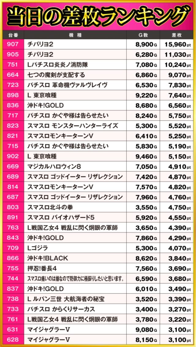 早速、店内状況をチェックすると『チバリヨ2』が特に盛り上がりを見せており、907番台が+15,960pt、905番台が+11,030ptと万枚超を連発させ見事なワン・ツーフィニッシュを決めている。また、続く『Lパチスロ炎炎ノ消防隊』も万枚超を達成しており、差枚TOP3が実にハイレベルな結果を残していた。