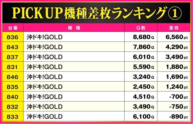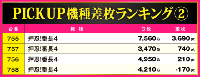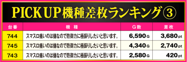 次にPICK UP機種をチェックしていこう。『沖ドキ!GOLD』からは+6,560pt、『押忍!番長4』からは+3,690ptを確認。そして、『スマスロ痛いのは嫌なので防御力に極振りしたいと思います。』は、744番台の+3,680ptを筆頭に3台全てがプラス差枚となる見事な結果を残しファンを喜ばせていた。