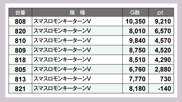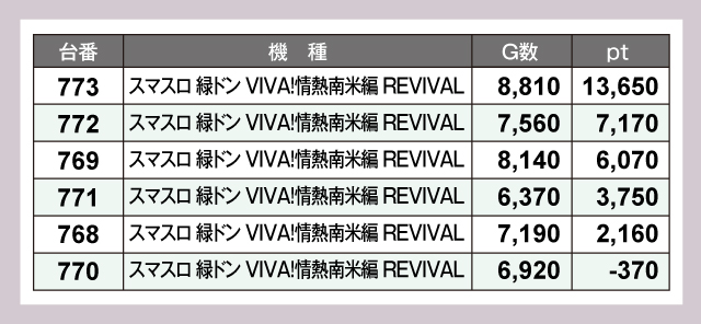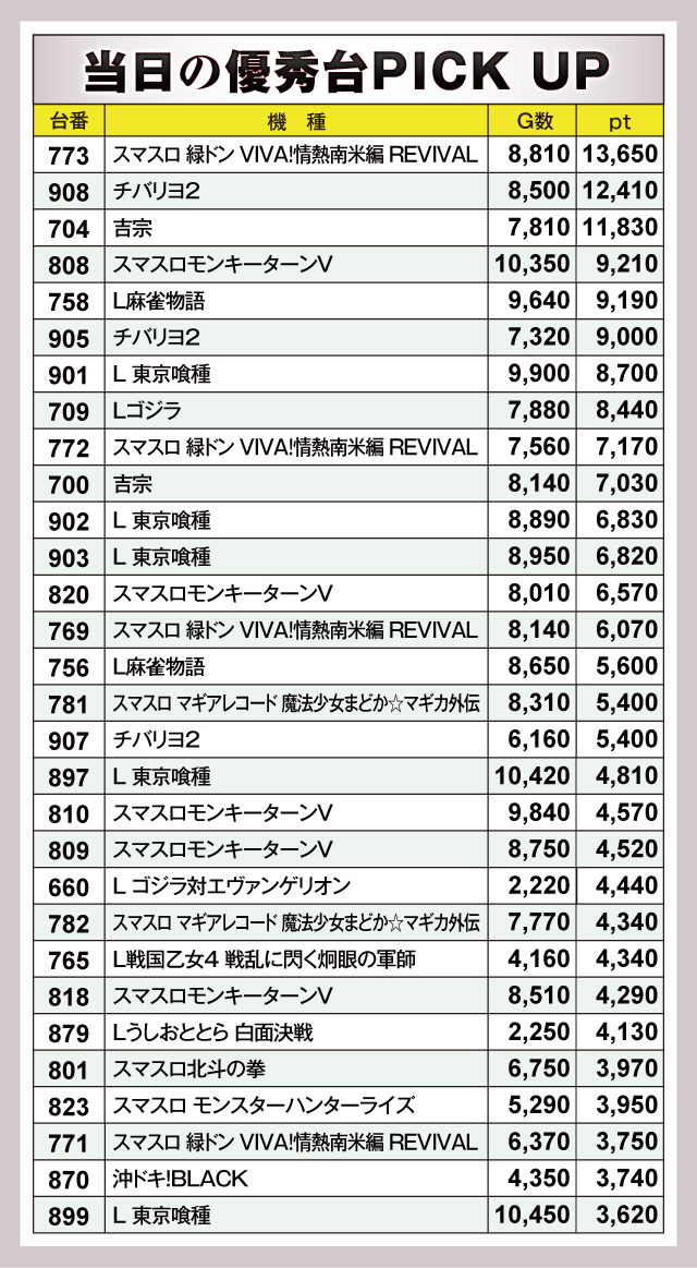 とくに目立っていたのは『スマスロ 緑ドン VIVA!情熱南米編 REVIVAL』で、773番台が+13,650ptという圧倒的な成果をあげた。次いで『チバリヨ2』908番台が+12,410pt、『吉宗』704番台が+11,830ptと1万ptオーバーの台が並ぶ。以下にも『スマスロモンキーターンV』808番台の+9,210ptなど、超優秀台がズラリと並ぶ壮観なデータとなっていた。