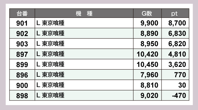 『スマスロ 緑ドン VIVA!情熱南米編 REVIVAL』と『L 東京喰種』、『スマスロモンキーターンV』は設置されている台の大多数がプラスptの好結果となっている。中には1万回転以上まわされた台もいくつかあり、この日のヒートアップぶりに華を添えていた。