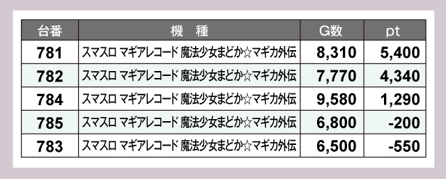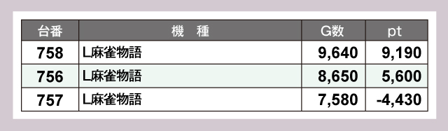 『スマスロ マギアレコード 魔法少女まどか☆マギカ外伝』と『L麻雀物語』は設置台数が比較的少なめながら、いずれの台も十分なG数が稼がれていて、それに呼応するかのように高水準のptを招いている。