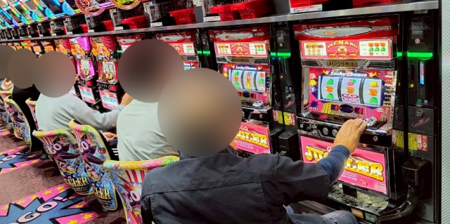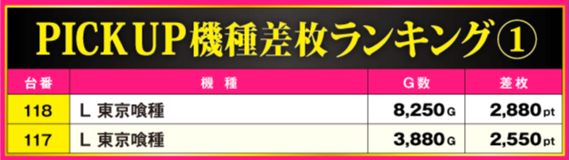 次にPICK UP機種の状況を見ていこう。2台設置されている『L 東京喰種』はどちらも+2,000pt超を記録。さらに、2つのジャグラーシリーズからも複数の好調台が確認されており、3機種トータルの全9台中6台がプラス差枚に。それぞれのシマは常に活気に満ち溢れる一日となっていた。