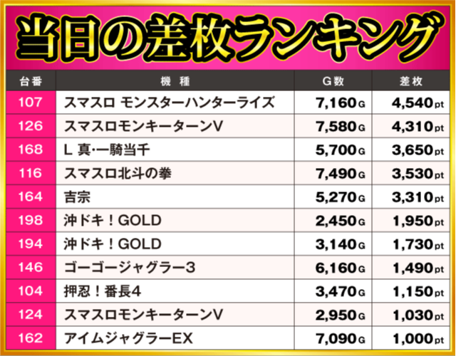 当日の差枚ランキング