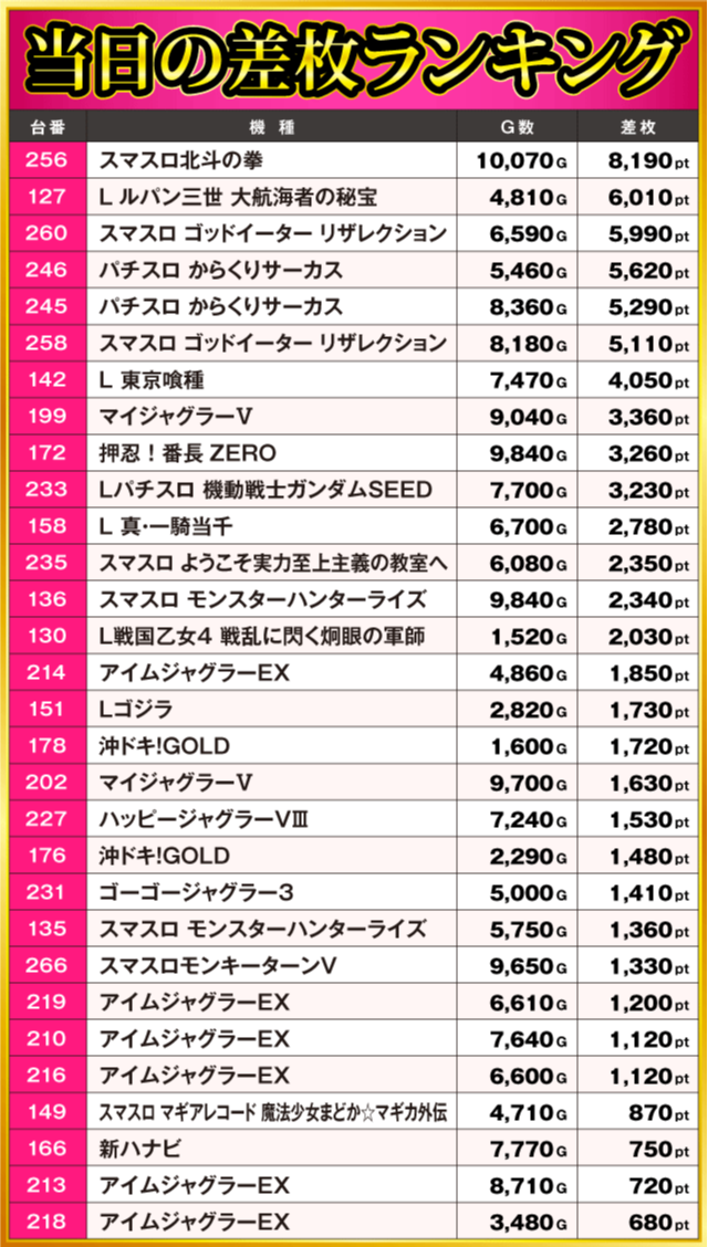 この日、最も目立っていたのが『スマスロ北斗の拳』で、256番台が+8,190ptを叩き出しランキングトップに。次いで『Lルパン三世 大航海者の秘宝』で+6,010pt、さらには『スマスロ ゴッドイーター リザレクション』と『パチスロ からくりサーカス』が+5,000pt超を記録するなど、人気のスマスロを中心にハイスコアが連発した。