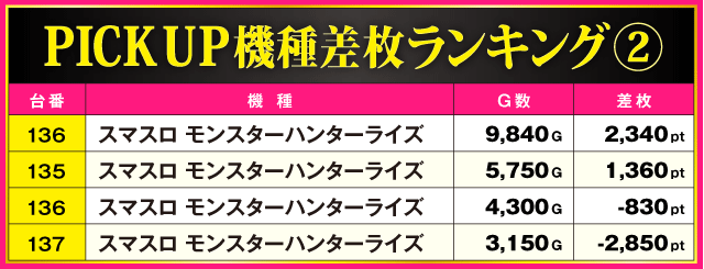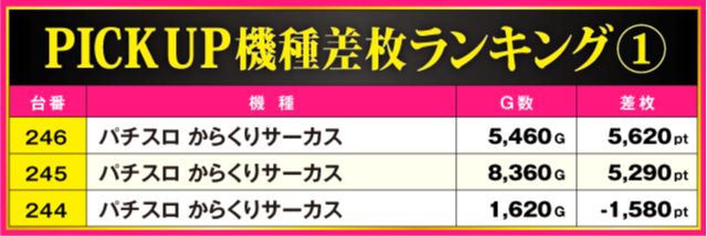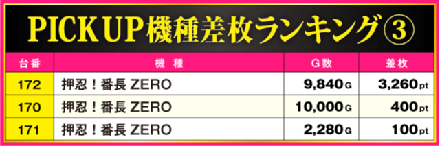 今回のPICK UP機種は全3機種。それぞれの機種で多数の好調台が確認されており、3機種トータルの全10台中7台がプラス差枚で実戦を終える盛況ぶりを見せている。ファンにとって充実の一日となったのは間違いないだろう。