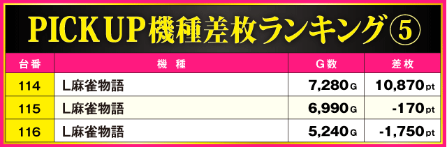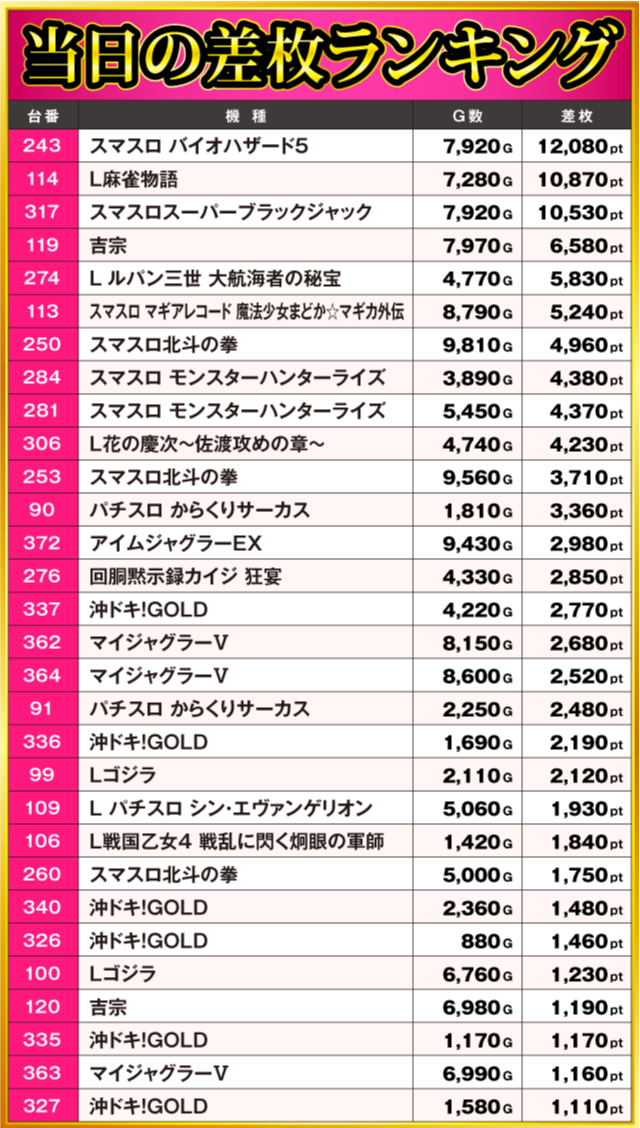 当日の差枚ランキング