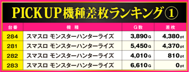 今回のPICK UP機種は全5機種。それぞれの機種で数々の好成績が確認されているが、なかでも目立っていたのが『スマスロ モンスターハンターライズ』で、+4,000pt超が2台も発生。しかも、全4台中3台がプラス差枚となっているだけに、ファンにとって充実の一日となったのは間違いないだろう。