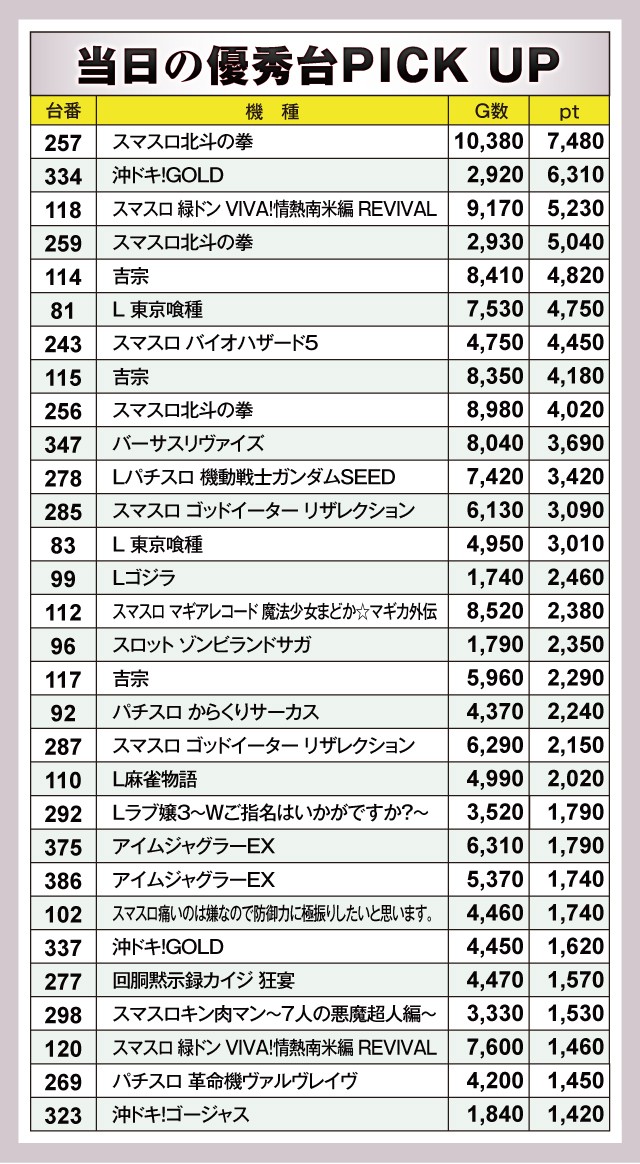 『スマスロ北斗の拳』257番台の+7,480ptを筆頭に『沖ドキ!GOLD』334番台+6,310pt、『スマスロ 緑ドン VIVA!情熱南米編 REVIVAL』118番台+5,230ptなど複数の機種が+5,000ptオーバーと理想的な展開を迎え、スロットコーナーを大いに盛り上げていた。