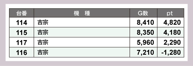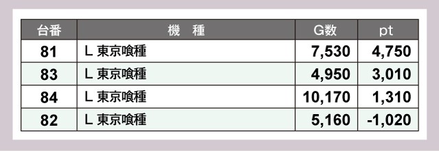 『吉宗』と『L 東京喰種』では、どちらも4台中3台が4桁ptプラスとなっており、両機種平均+2,000pt超と見事な記録を残している。