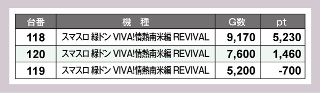 『スマスロ 緑ドン VIVA!情熱南米編 REVIVAL』は118番台が+5,230ptと優秀な内容だった。