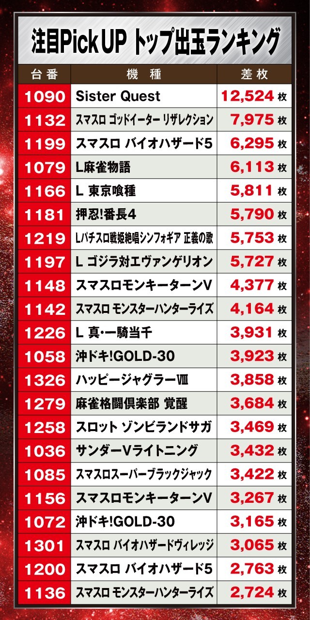 この日、最もプレイヤーの注目を集めたのが『Sister Quest』で、1090番台が+12,524枚を叩き出しランキングトップに。次いで『スマスロ ゴッドイーター リザレクション』が+7,975枚、『スマスロ バイオハザード5』と『L麻雀物語』が+6,000枚超を記録している。