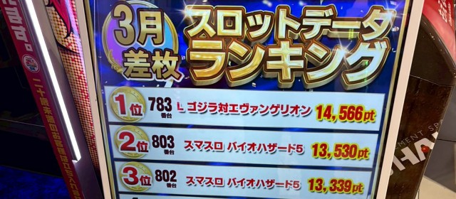 加えて『L戦国乙女4 戦乱に閃く炯眼の軍師』の+7,100枚超、『スマスロ バイオハザード5』の+7,000枚弱、『スマスロ アイドルマスター ミリオンライブ! ネクストプロローグ』の+6,700枚超、『吉宗』では+5,500枚付近に2台と、スマスロの躍進が日を跨いで受け継がれていた。