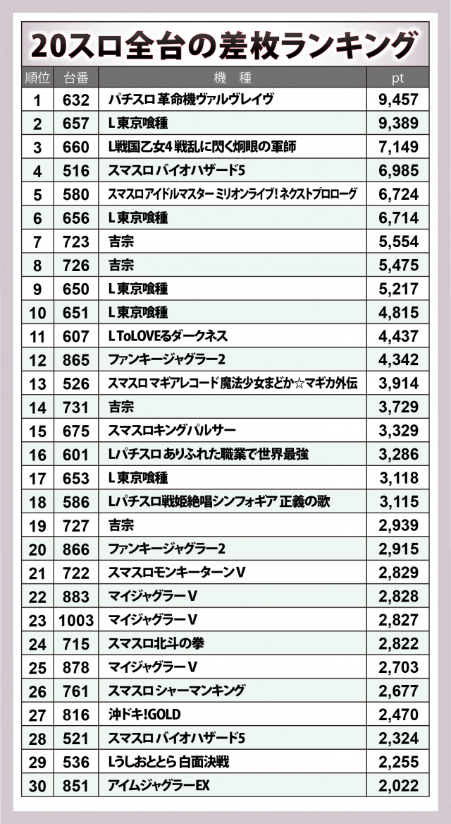 30台が全て+2,000枚を上回り、+3,000枚以上は18台、+4,000枚以上は12台、+5,000枚オーバーは9台、+6,000枚オーバーは6台、+7,000枚オーバーは3台、+9,000枚オーバーは2台と、5桁プラスこそカウントできなかったがこれまでの高水準をキープできた。