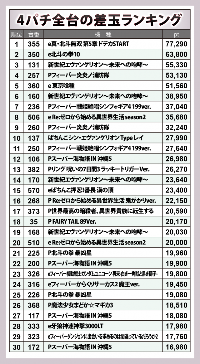 さらに『e北斗の拳10』の+63,800個超、『新世紀エヴァンゲリオン~未来への咆哮~』では+55,300個超・+39,000個弱が1台ずつ、『e 東京喰種』の+51,600個弱、『Pフィーバー戦姫絶唱シンフォギア4 199ver.』の+37,000個超など、ベテランから導入間もない機種まで幅広いスペックが大量獲得を招いた。