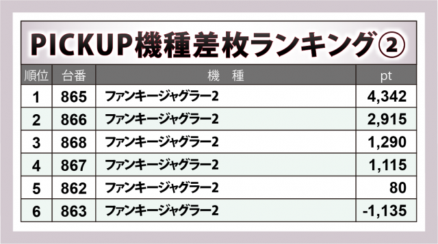 『ファンキージャグラー2』は865番台が+4,300枚超とボーナスタイプのポテンシャルを遺憾なく発揮。勝率が高かったのも特筆すべき点だ。