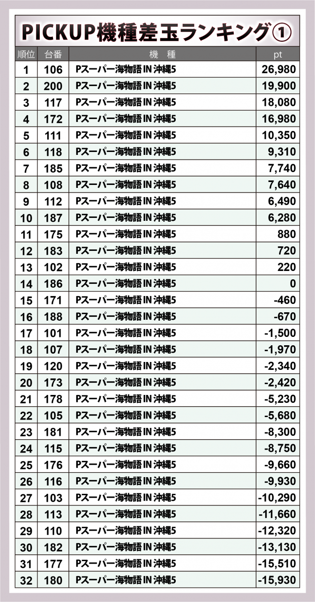 『Pスーパー海物語 IN 沖縄5』では+27,000枚弱を皮切りに+10,000個台後半が3台と、安定度の高さを誇った。