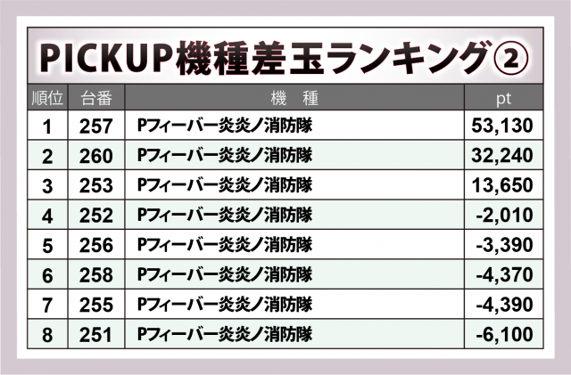 『Pフィーバー炎炎ノ消防隊』は勝率こそ低めだったがプラスの3台が全て5桁の数値をマーク。中でも257番台が+53,100枚超と素晴らしいスコアに。