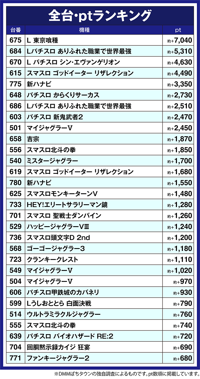 「新ハナビ」の775番台も約+3,350ptと、ボーナスが軸となる機種も活気があった。