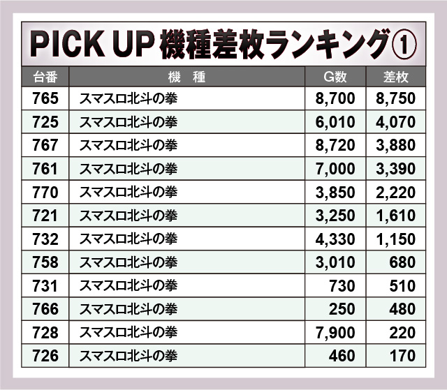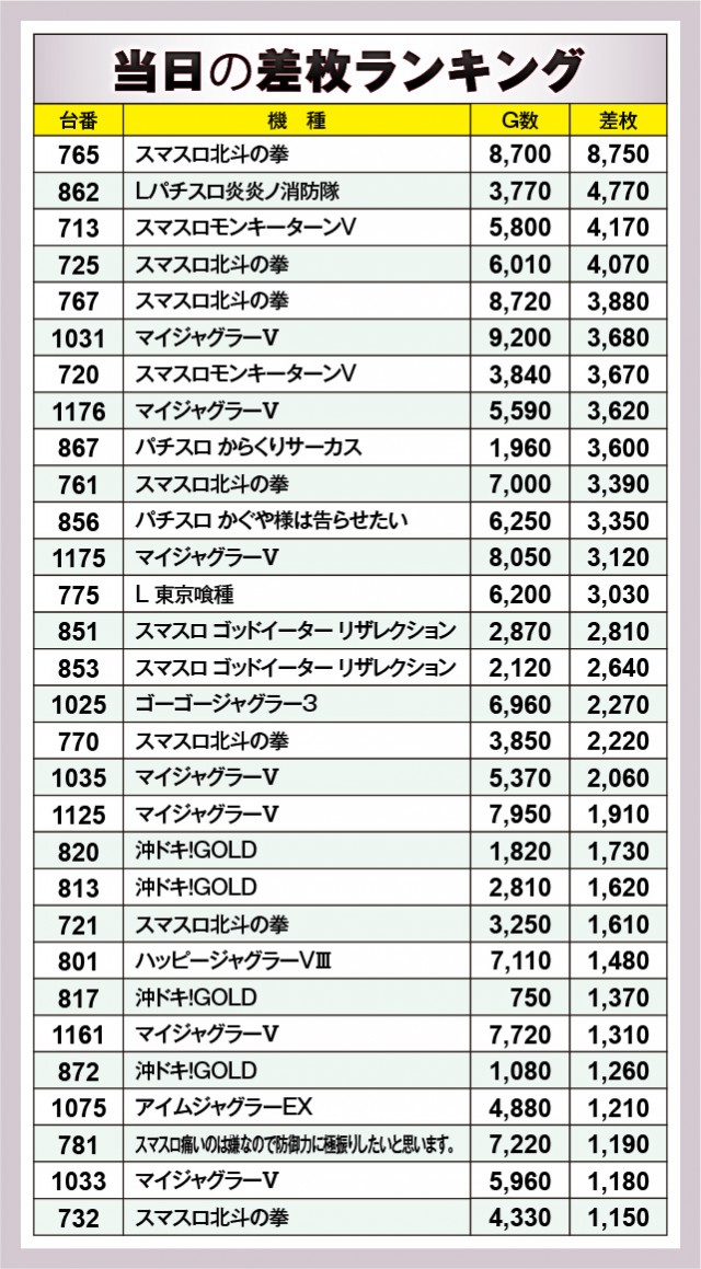 『スマスロ北斗の拳』にて8,000枚OVERの大きな熱気が放たれ、店内の盛り上がりを牽引。その後ろには『Lパチスロ炎炎ノ消防隊』『スマスロモンキーターンV』が4,000枚OVERと続いており、他にもまとまった出玉を確保する台が多発していた。ファンは大きな熱量に心を躍らせていたのは当然、終日を通して打ち込まれた形跡から察するに、大きな手応えを感じていたのは確かだろう。