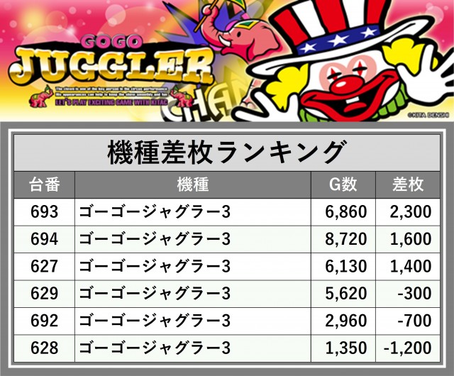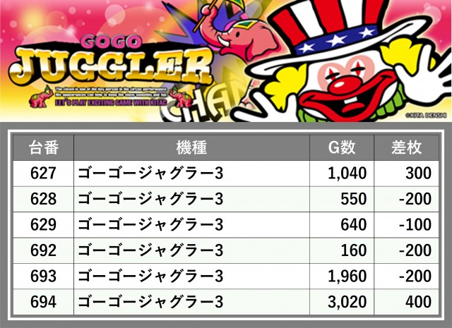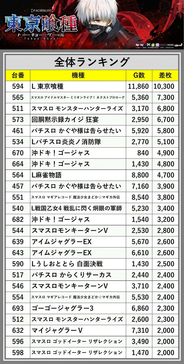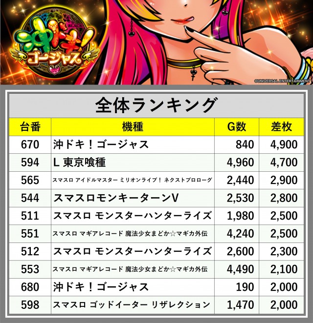 厳選された取材対象機種をはじめ、その他スロット全体から好記録が飛び出した!プレイヤーが楽しんだ1日を下記データにて振り返ってみて欲しい。