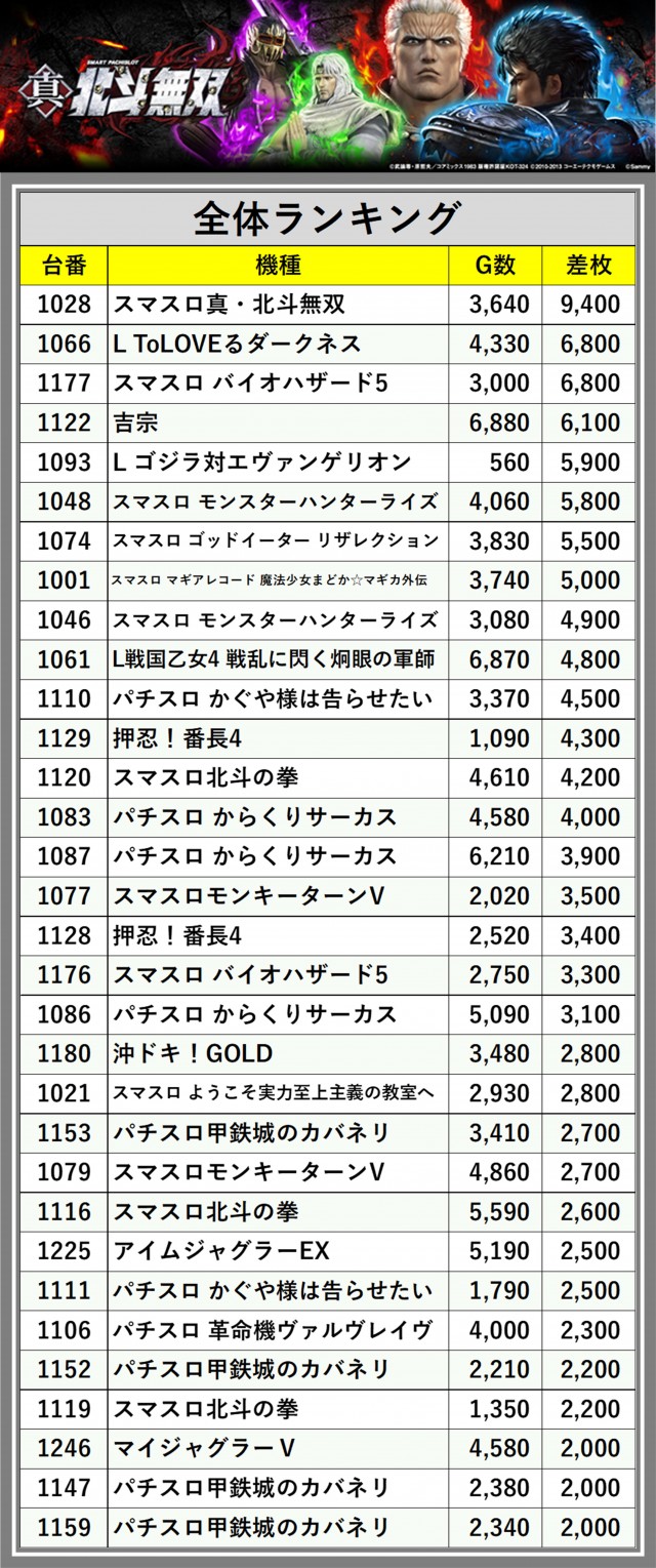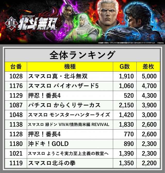 厳選された取材対象機種をはじめ、その他スロット全体から好記録が飛び出した!プレイヤーが楽しんだ1日を下記データにて振り返ってみて欲しい。