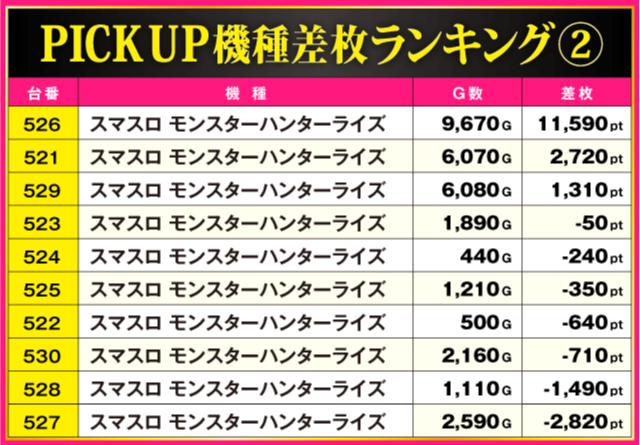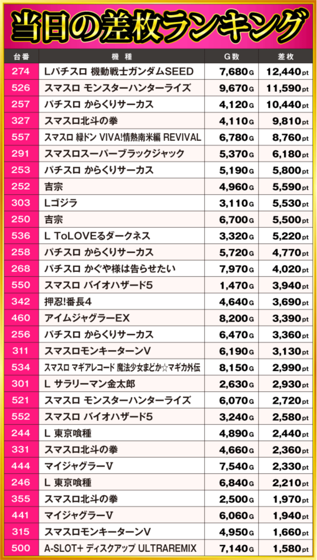 この日、最もプレイヤーの注目を集めたのが『Lパチスロ 機動戦士ガンダムSEED』で、274番台が+12,440ptを叩き出しランキングトップに。さらに、『スマスロ モンスターハンターライズ』と『パチスロ からくりサーカス』も万枚超を達成しており、差枚ベスト3が実にハイレベルな結果を残している。