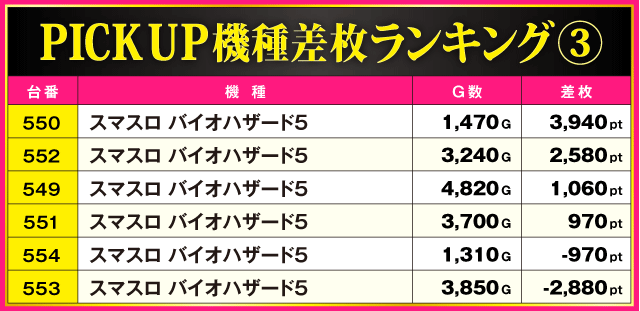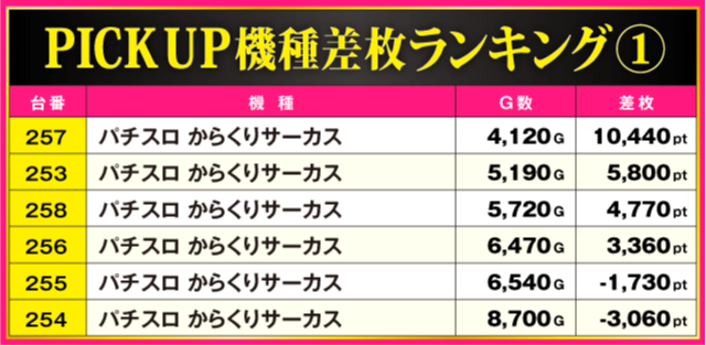 次にPICK UP機種の状況を見ていこう。『パチスロ からくりサーカス』は万枚超以外にも+5,800ptに+4,770ptとハイスコアを連発。また、『スマスロ バイオハザード5』は全6台中4台がプラス差枚となる盛況ぶりを見せファンを喜ばせていた。