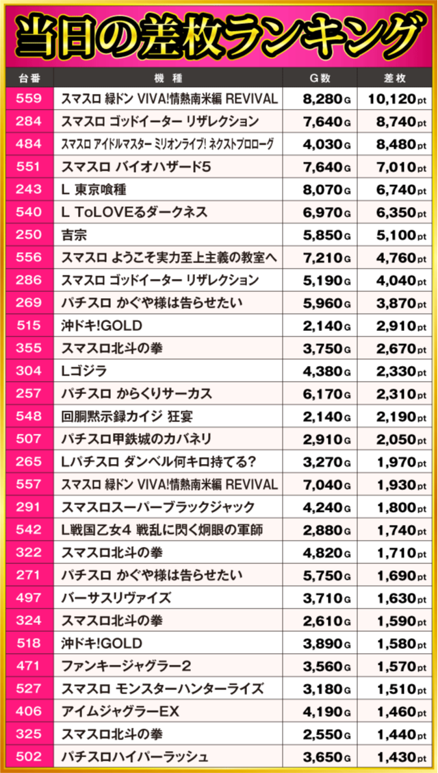 この日は、導入直後の『スマスロ 緑ドン VIVA!情熱南米編 REVIVAL』が万枚超の+10,120ptを叩き出しランキングトップに。また、『スマスロ アイドルマスター ミリオンライブ! ネクストプロローグ』で+8,480pt、『スマスロ ようこそ実力至上主義の教室へ』で+4,760ptなど、新台の活躍も実に印象的であった。