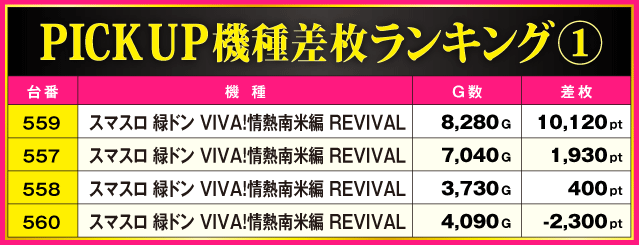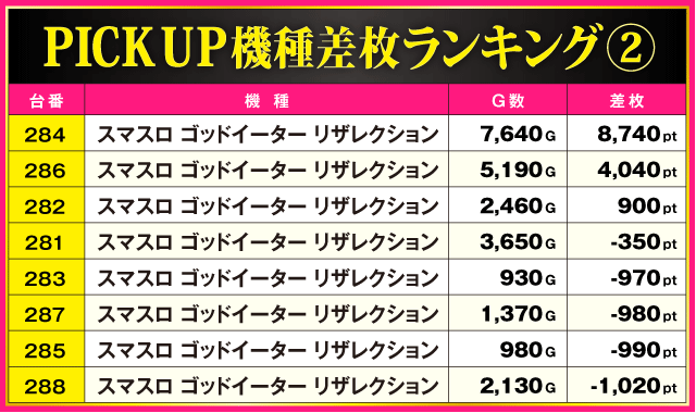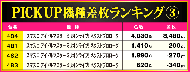 次にPICK UP機種の状況を見ていこう。『スマスロ 緑ドン VIVA!情熱南米編 REVIVAL』と『スマスロ アイドルマスター ミリオンライブ! ネクストプロローグ』は、半数の台がプラス差枚となる見事な結果を残している。さらに、『スマスロ ゴッドイーター リザレクション』からは+8,740ptが飛び出し店内を盛り上げていた。