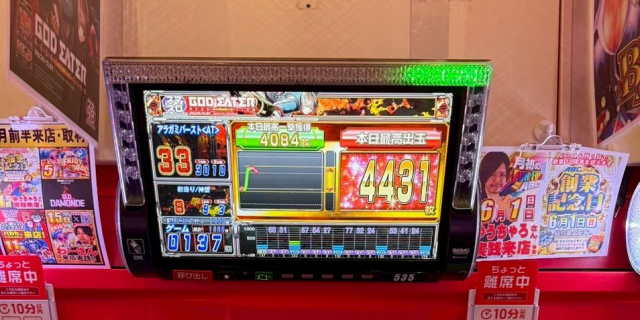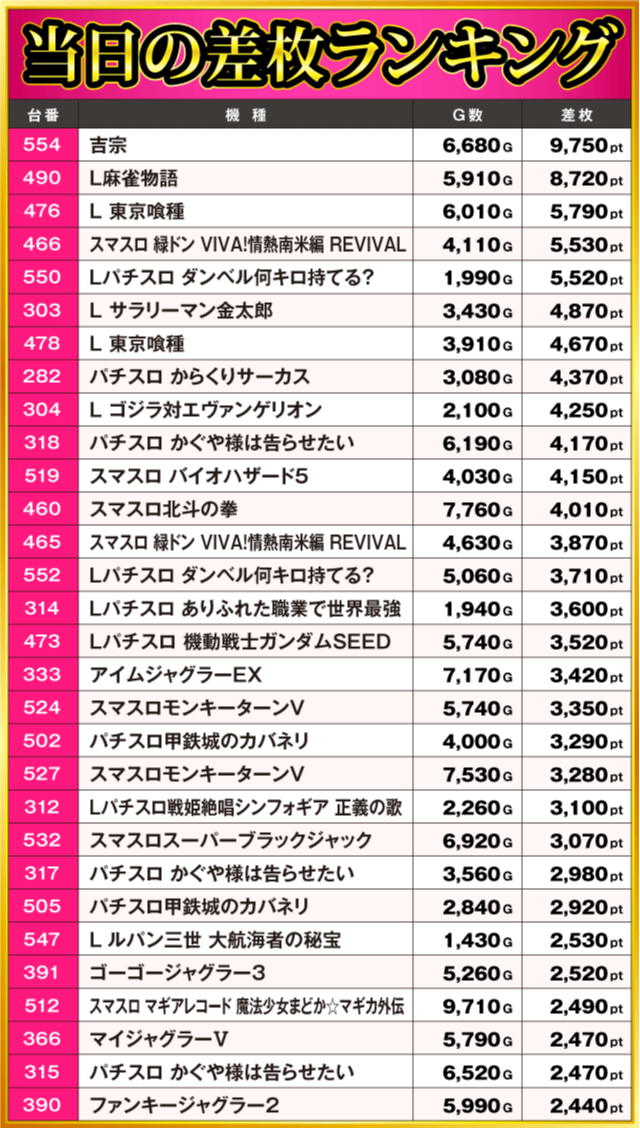 この日は、人気のスマスロを中心に多数の好調台を確認。そんな中、『吉宗』が+9,750ptを叩き出しランキングトップに。また、他にも『L麻雀物語』の+8,720ptをはじめ様々な機種から+4,000pt超が大量発生し店内を盛り上げていた。