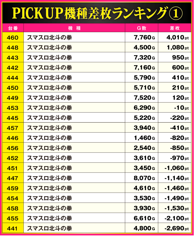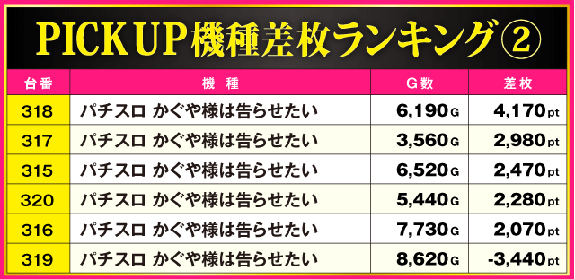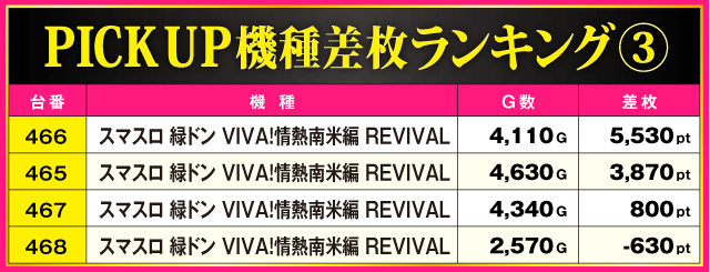 次にPICK UP機種の状況をチェック!! 『スマスロ 緑ドン VIVA!情熱南米編 REVIVAL』からは+5,530pt、『スマスロ北斗の拳』と『パチスロ かぐや様は告らせたい』からは+4,000pt超が発生。しかも、3機種トータルの全30台うち半数の台がプラス差枚となっているだけに、ファンにとって充実の一日となったのは間違いないだろう。