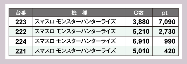 『スマスロ モンスターハンターライズ』は設置4台すべてがプラスptとなり、7,000ptオーバーも飛び出す大活躍だった。