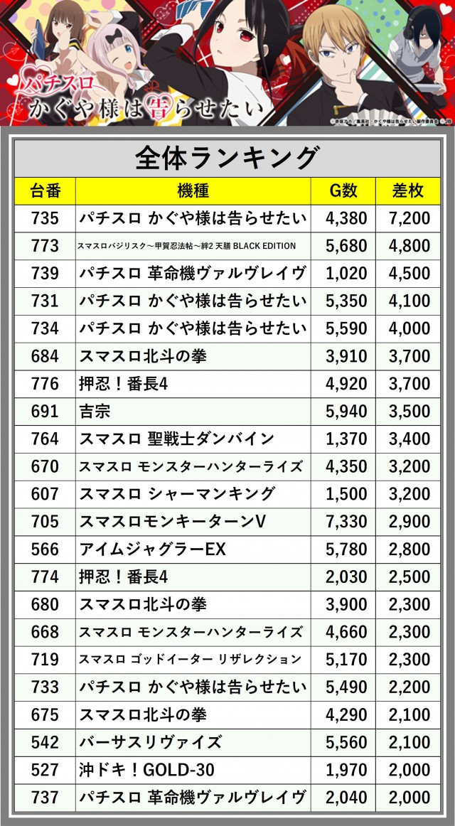 ※差枚数順に掲載しています
