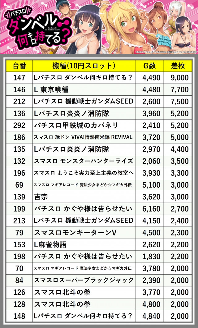 ※差枚数順に掲載しています