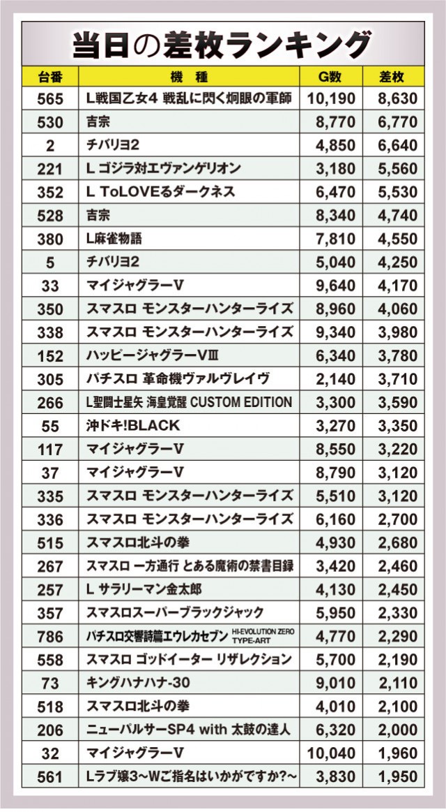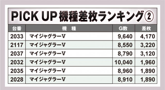 『マイジャグラーⅤ』はプラス差枚数の台をそれ以外の2機種は全台のデータを掲載している。どの台がどれくらいの差枚数だったか、確認しておこう。