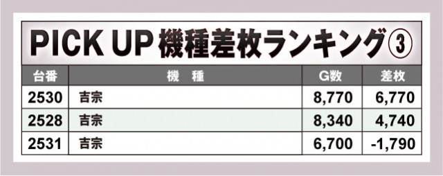 気になるのはランキングの2番目と6番目にランクインしている『吉宗』だ。初代から受け継がれたBIG一発711枚獲れる注目の機種だが、やはりその出玉性能は侮れない。530番台から+6,770枚。528番台から+4,740枚となった。