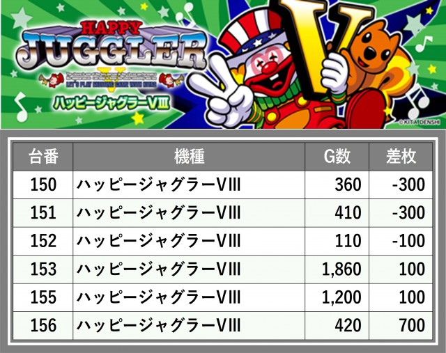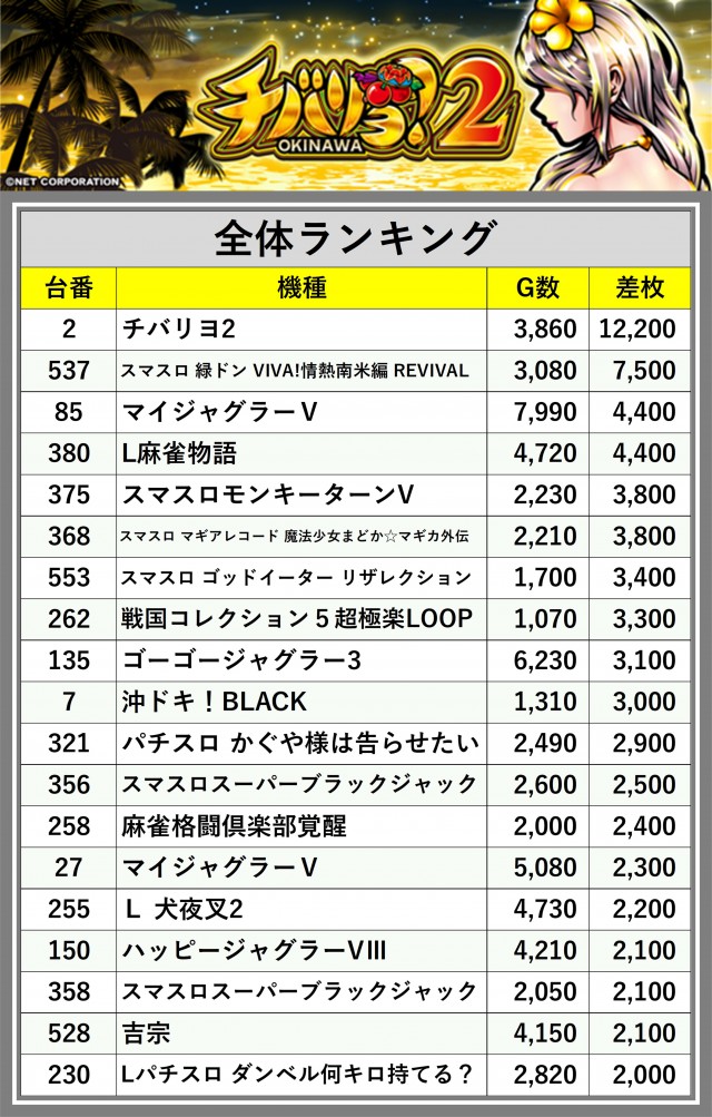 厳選された取材対象機種をはじめ、その他スロット全体から好記録が飛び出した!プレイヤーが楽しんだ1日を下記データにて振り返ってみて欲しい。
