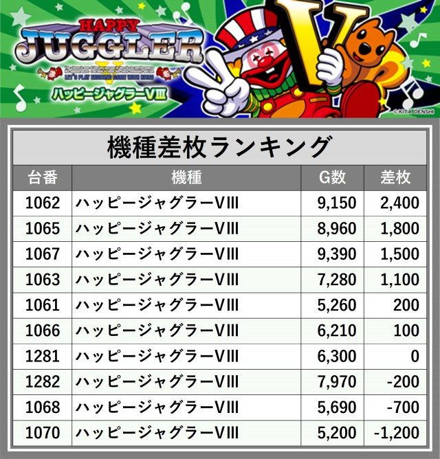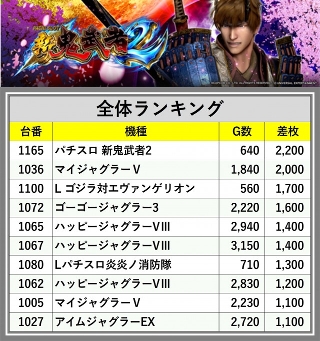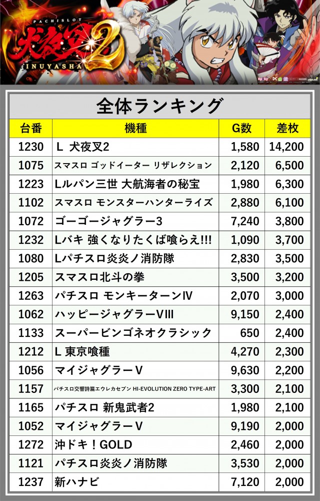 厳選された取材対象機種をはじめ、その他スロット全体から好記録が飛び出した!プレイヤーが楽しんだ1日を下記データにて振り返ってみて欲しい。