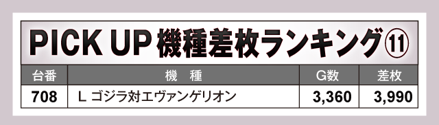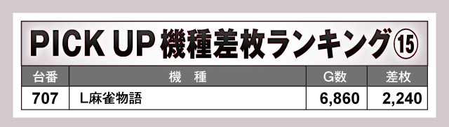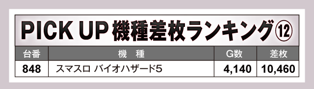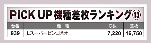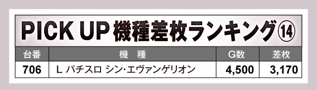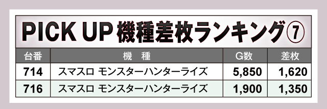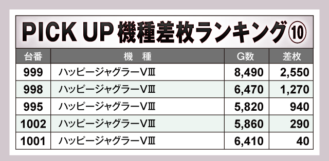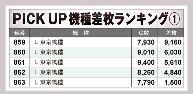 数あるPICK UP機種の中で、特に目立っていたのが『L 東京喰種』。859番台から万枚目前の+9,160枚が飛び出している上に、全台がプラス差枚となる見事な結果を残しファンを喜ばせていた。また、看板機種のジャグラーシリーズをはじめその他の機種も軒並み半数以上の台がプラス差枚で実戦を終えている。