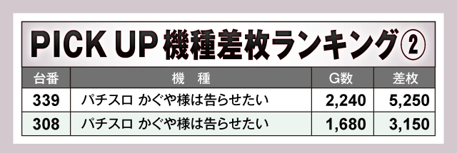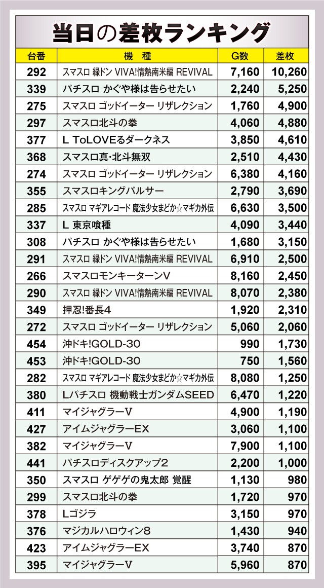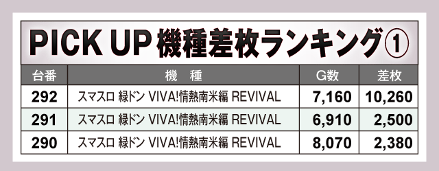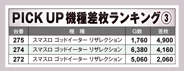 今回のPICK UP機種は全3機種で、各機種ともランキング上位台以外からも多数の好成績が発生している。さらに、3機種トータルの全12台中8台がプラス差枚で実戦を終えているだけに、ファンにとって充実の一日となったのは間違いないだろう。