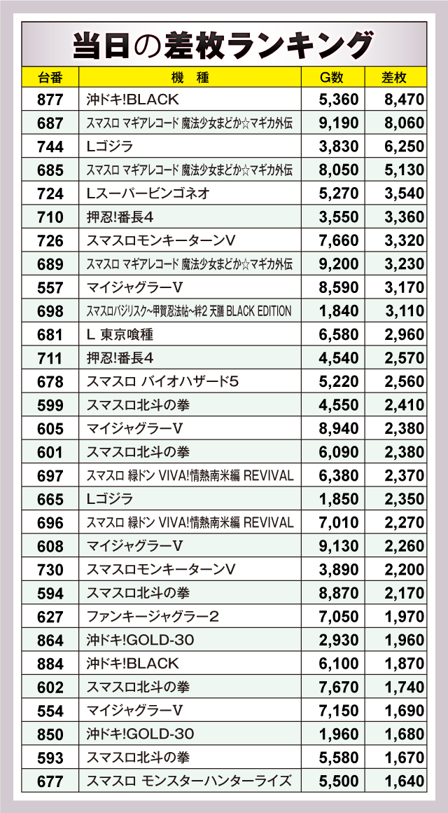 この日、最もプレイヤーの注目を集めたのが『沖ドキ!BLACK』で、877番台が+8,470枚を叩き出しランキングトップに。また、2位にランクインした『スマスロ マギアレコード 魔法少女まどか☆マギカ外伝』は+8,060枚をはじめ+5,130枚、+3,230枚と好成績を連発させ、全5台中3台がTOP10に入る盛況ぶりを見せていた。