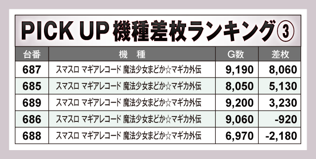 今回のPICK UP機種は全3機種で、ランキング上位に複数の台が入った『スマスロ マギアレコード 魔法少女まどか☆マギカ外伝』以外の『スマスロ北斗の拳』と『マイジャグラーⅤ』からも多数の好調台を確認。最終的に両機種とも半数以上の台がプラス差枚となる見事な結果を残しファンを喜ばせていた。