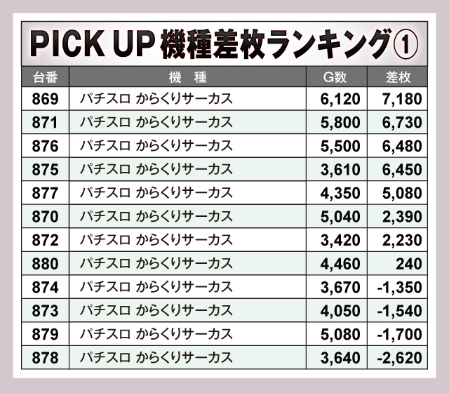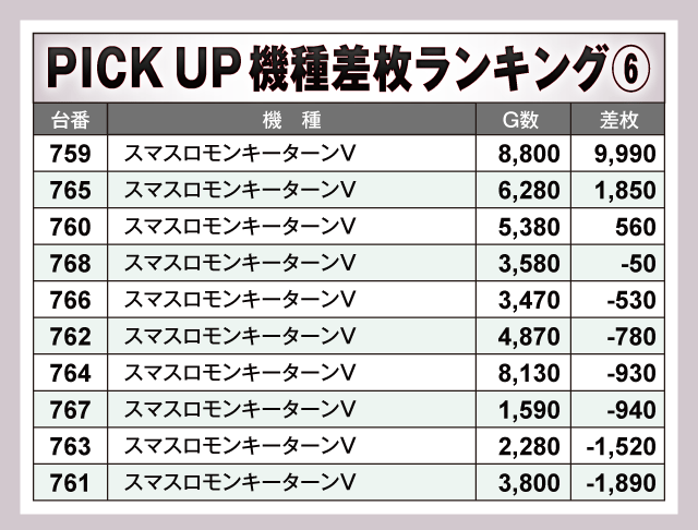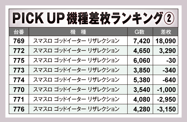 この日、最もプレイヤーの注目を集めたのが『スマスロ ゴッドイーター リザレクション』で、769番台が怒涛の+18,090枚を叩き出し堂々のランキングトップに輝いた。また、続く『チバリヨ2』も万枚超を達成、『スマスロモンキーターンV』が万枚目前の+9,990枚と、ベスト3が実にハイレベルな結果を残している。
