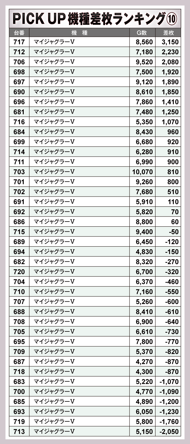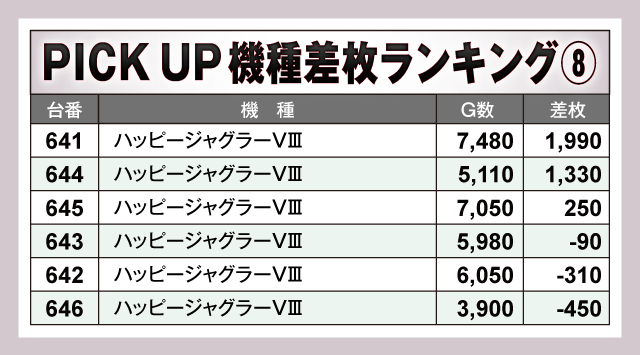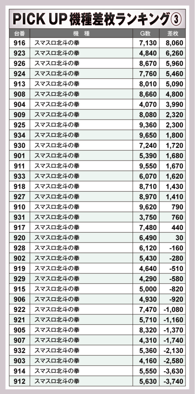 数あるPICK UP機種の中で、特に目立っていたのが『スマスロ北斗の拳』。916番台の+8,060枚を筆頭に+4,000枚超が5台も発生している上に、全34台中20台がプラス差枚となる見事な結果を残しファンを喜ばせていた。また、看板機種のジャグラーシリーズも軒並み半数以上の台がプラス差枚で実戦を終えている。